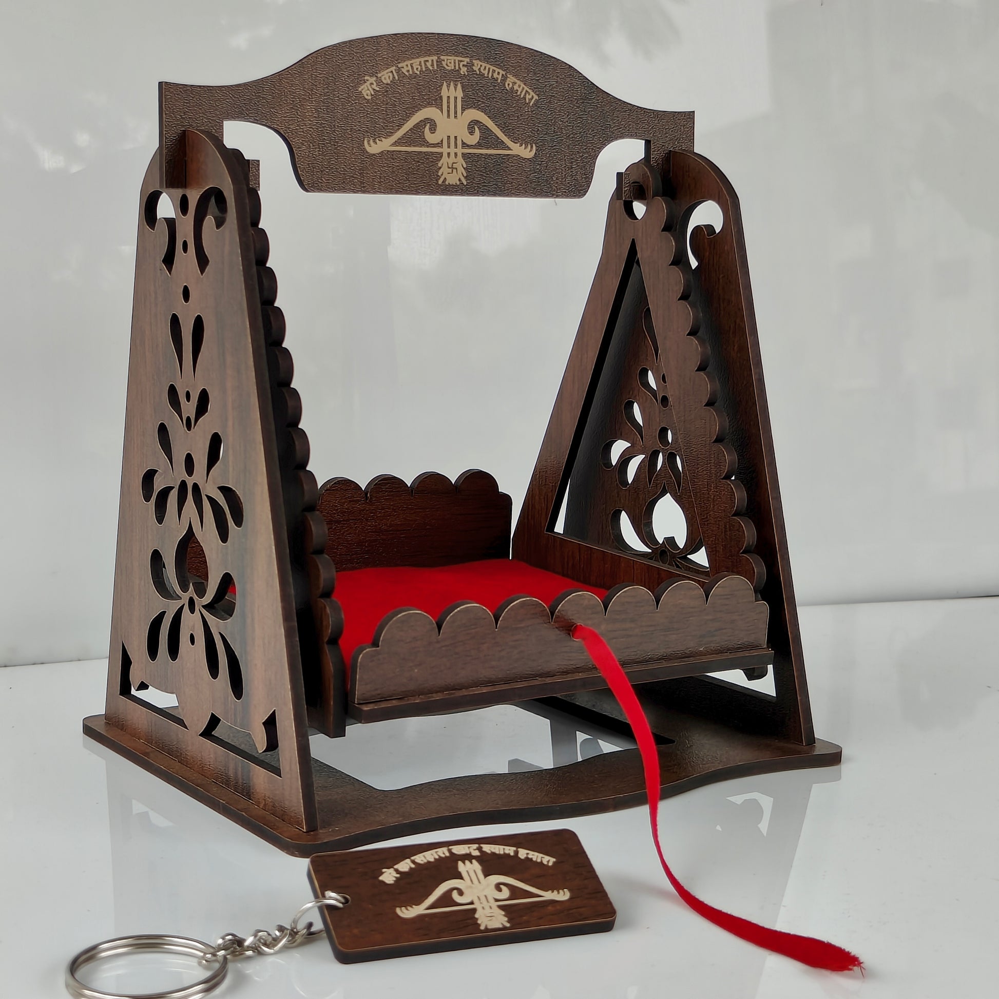 This beautifully laser-cut wooden swing features a plush red velvet seat and comes with a matching keychain, engraved with the sacred message "Hare Ka Sahara Khatu Shyam Hamara." The precision of the laser cutting highlights the intricate details, making it a perfect throne for your Khatu Shyam Baba idol.
