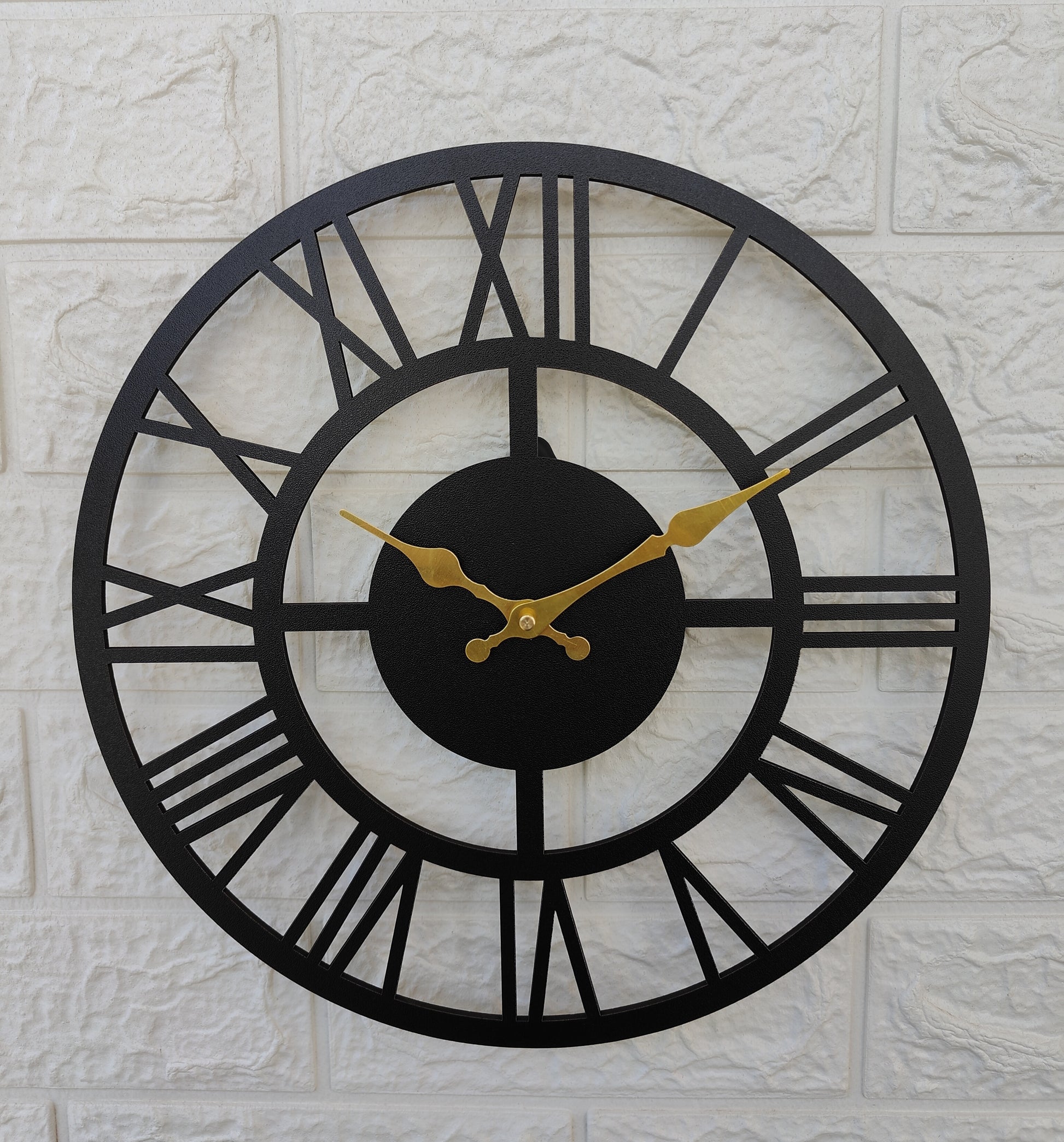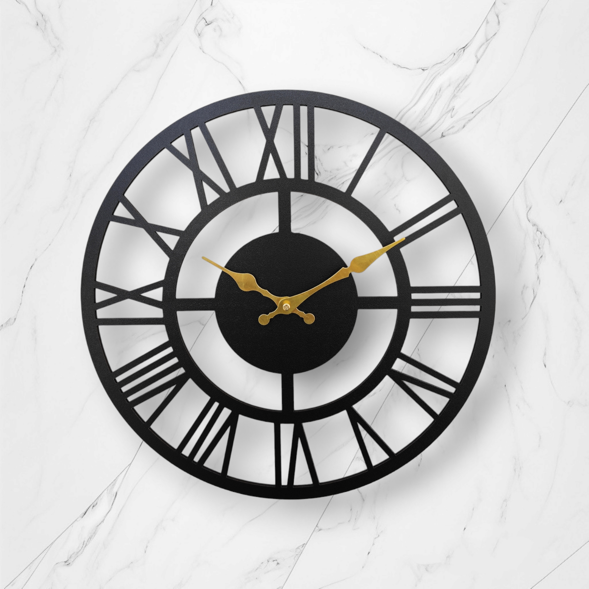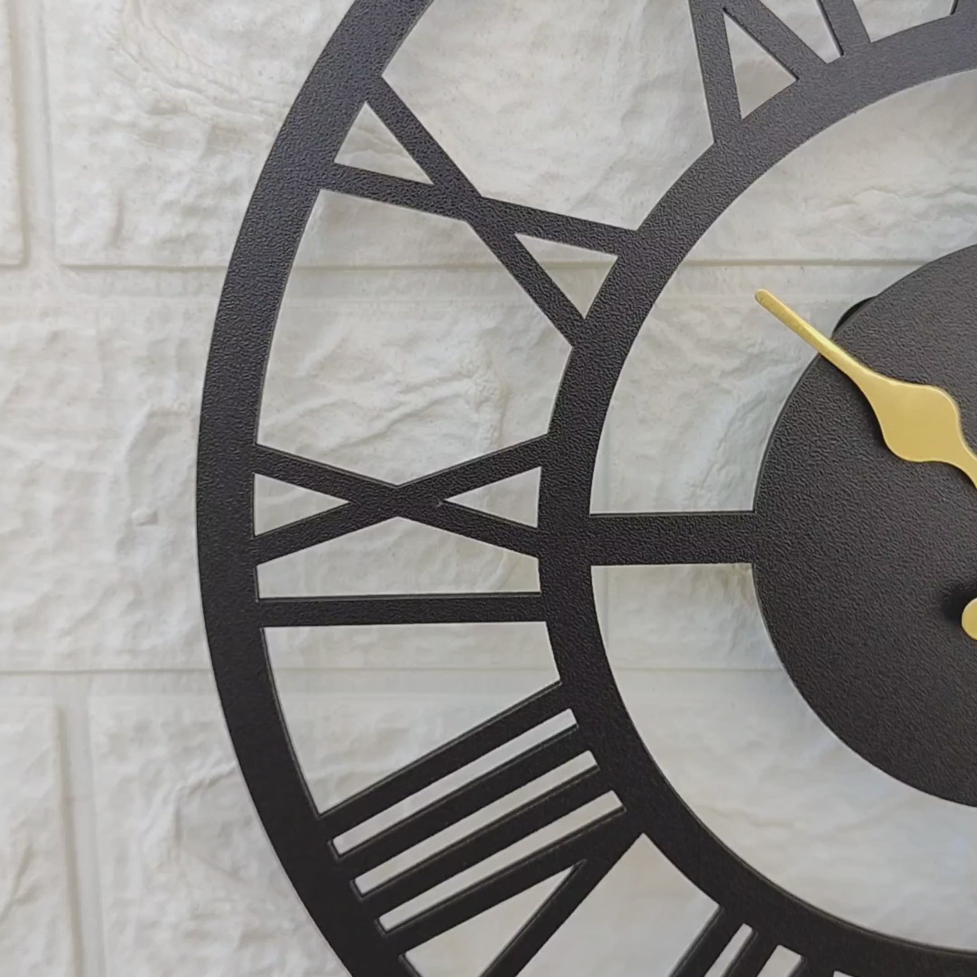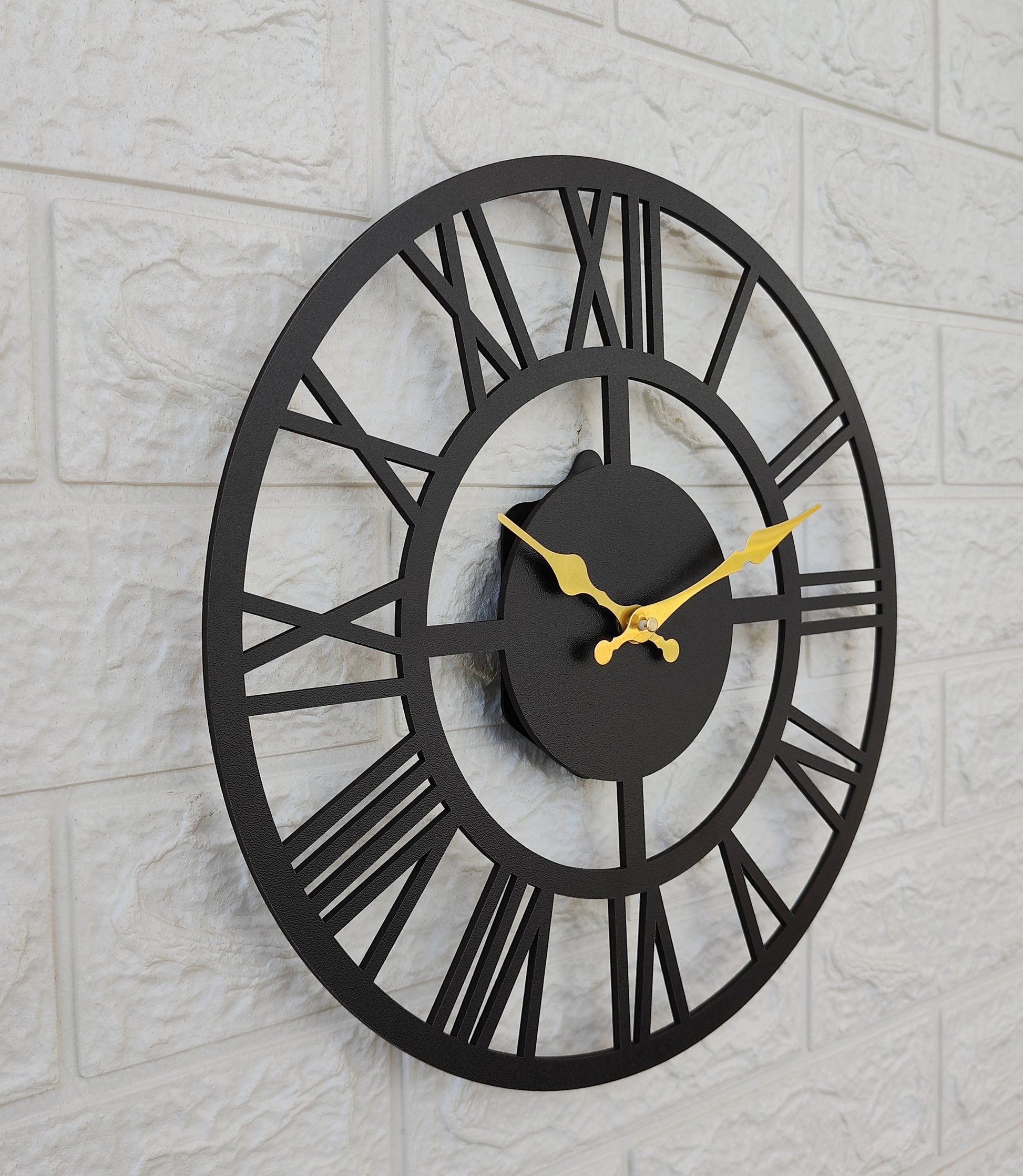 Elevate your home decor with our classic Roman numeral wall clock. This elegant timepiece features a sleek, black metal frame and bold gold Roman numerals against a minimalist backdrop. Its timeless design complements a variety of interior styles, from modern to traditional. The quiet, non-ticking movement ensures a peaceful environment.