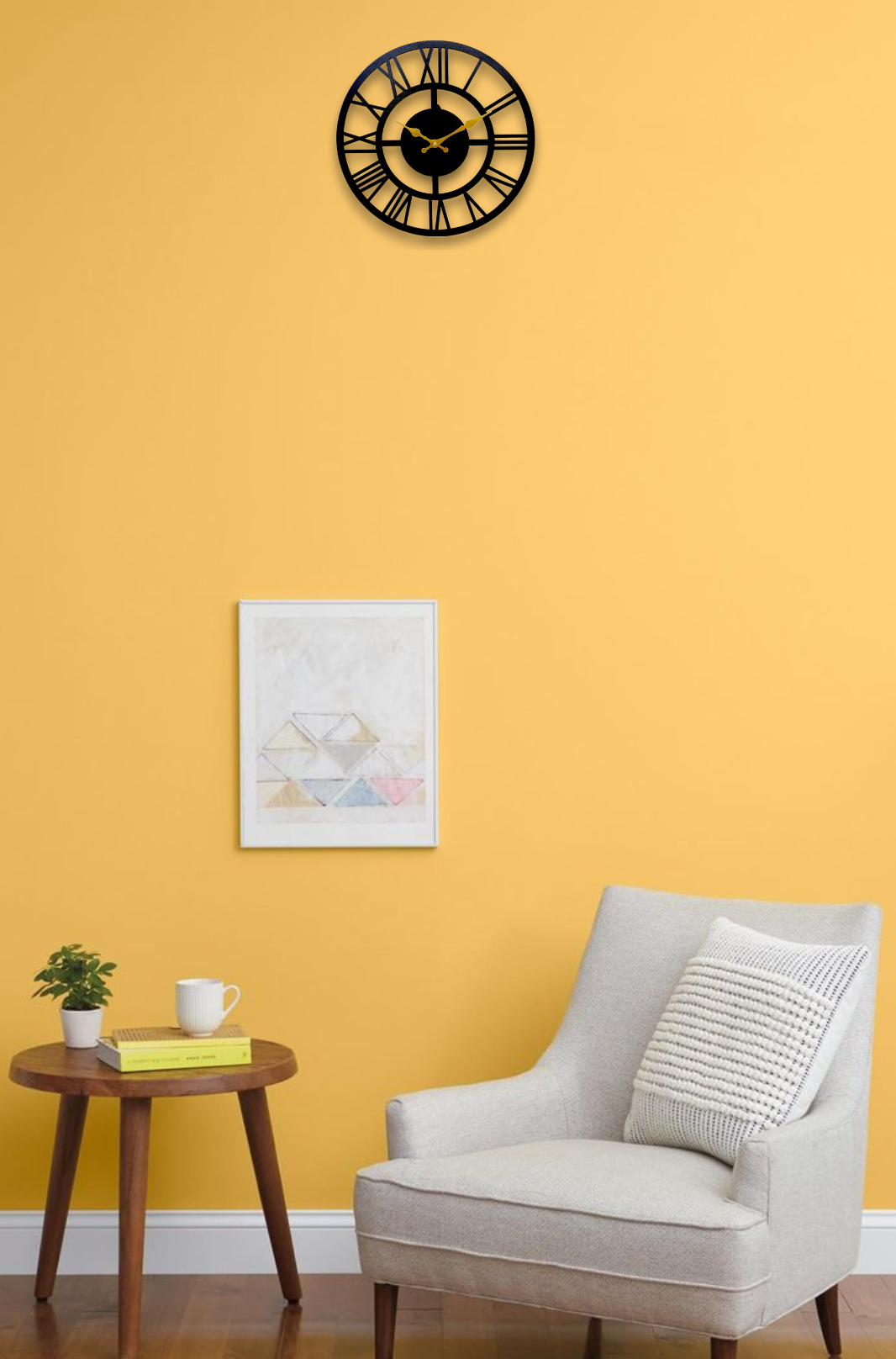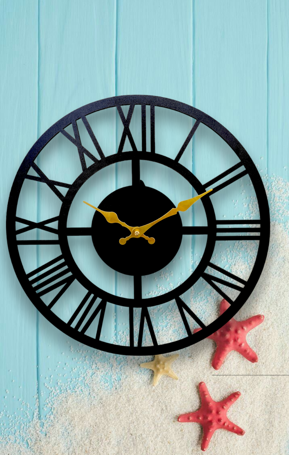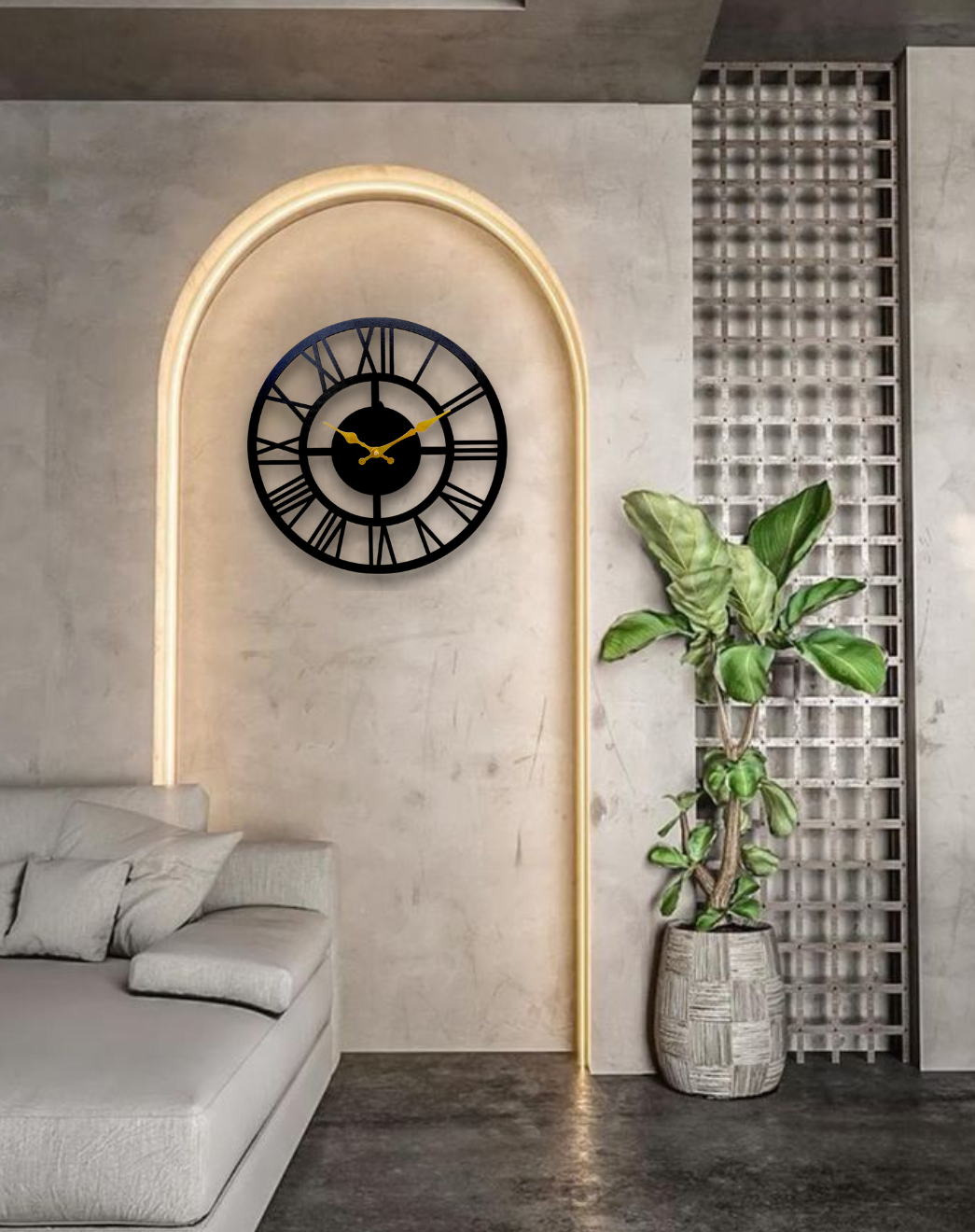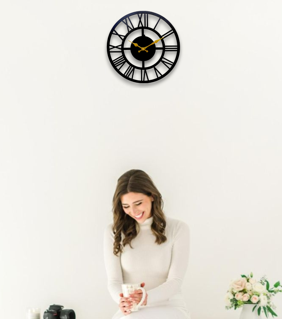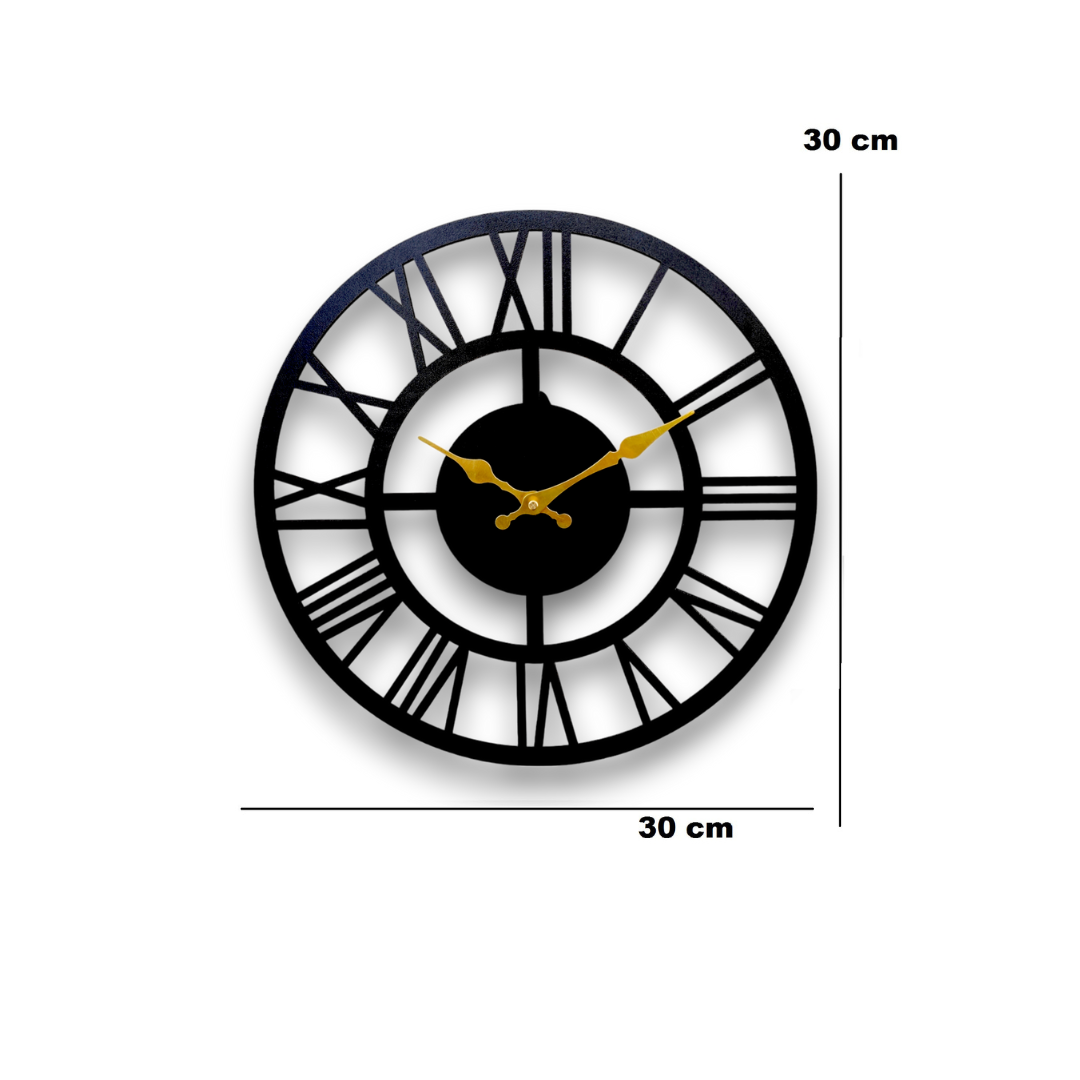 Elevate your home decor with our classic Roman numeral wall clock. This elegant timepiece features a sleek, black metal frame and bold gold Roman numerals against a minimalist backdrop. Its timeless design complements a variety of interior styles, from modern to traditional. The quiet, non-ticking movement ensures a peaceful environment.