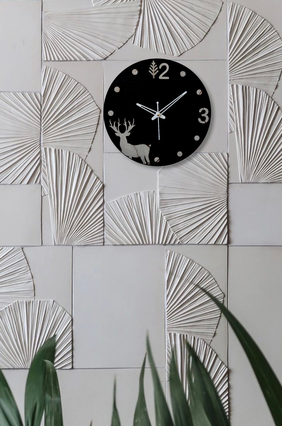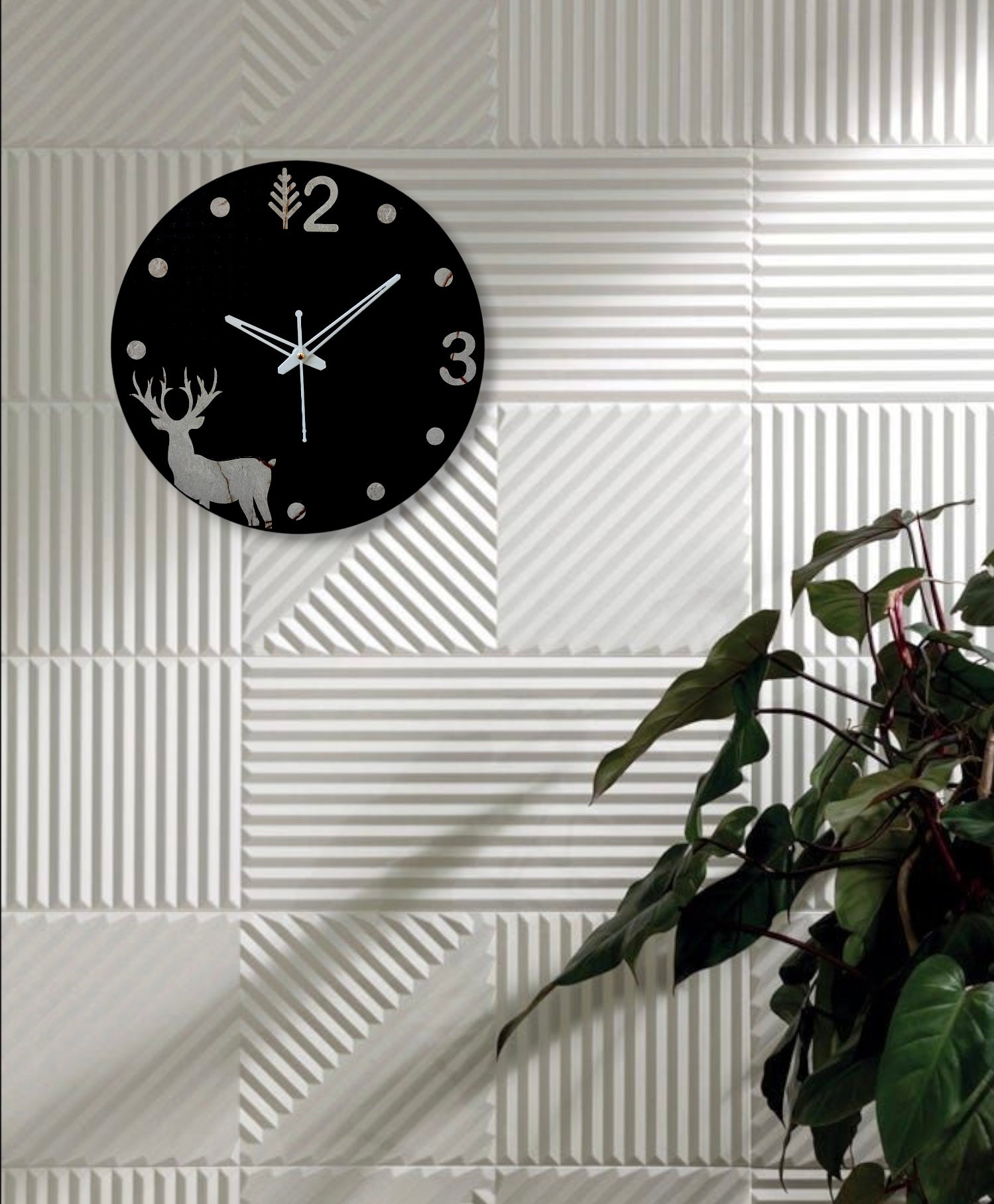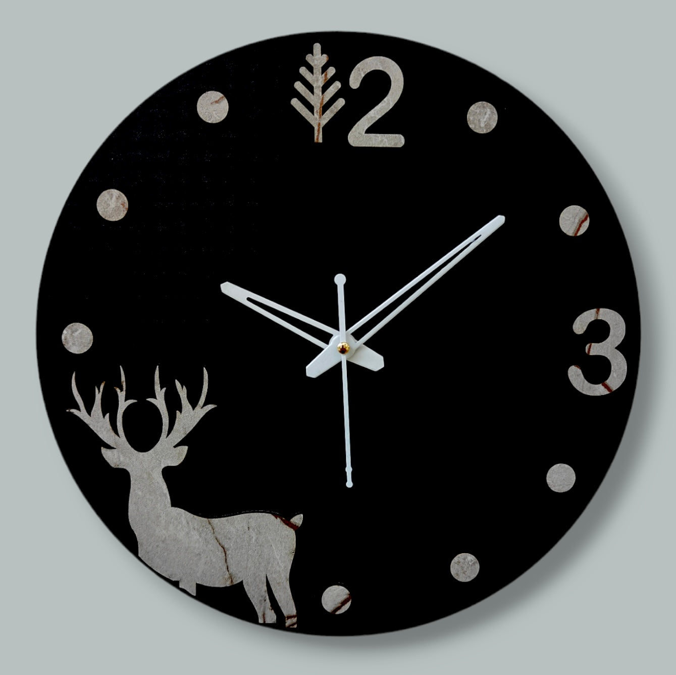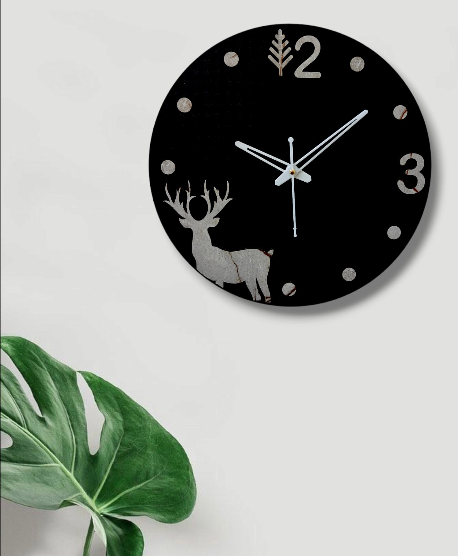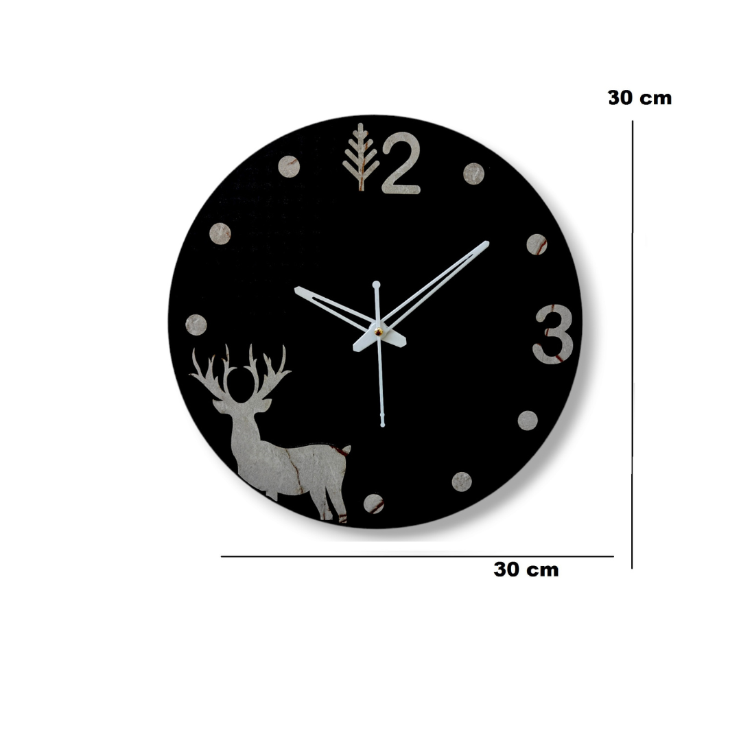 This charming wall clock features a rustic, marble-effect design with a silhouette of a deer. - The clock hands are black and the numbers are clear and easy to read.